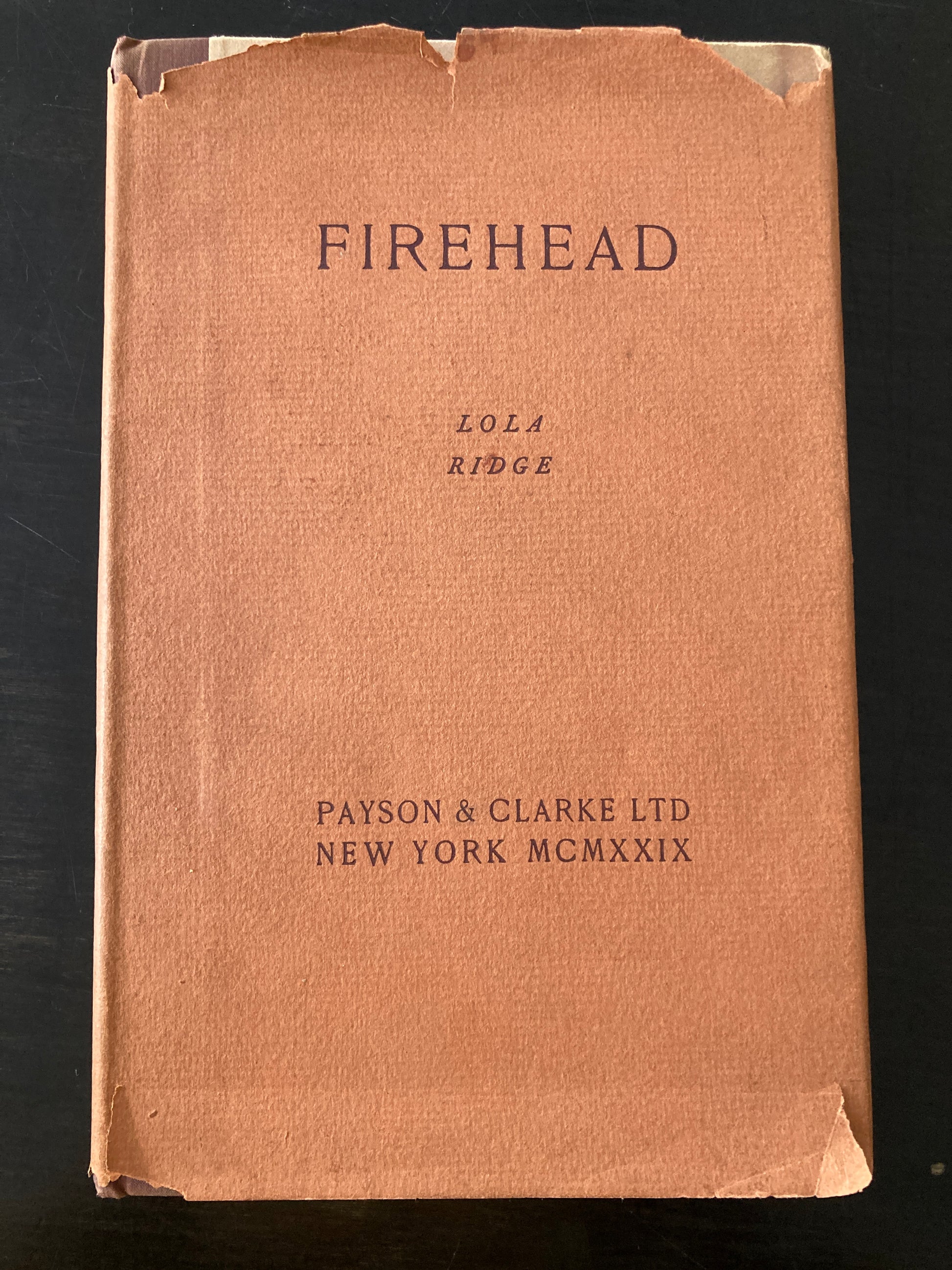 Lola Ridge. Firehead. Hardcover, Octavo. Dustjacket good, with closed tears to bottom and open tears to front top corners. Boards and Interior Very Good. First Edition. :New York Payson & Clarke Ltd. 1929. Anarchist poet and author Lola Ridge's lyrical narrative woven from her emotions in the wake of the judicial murder of Sacco & Vanzetti.